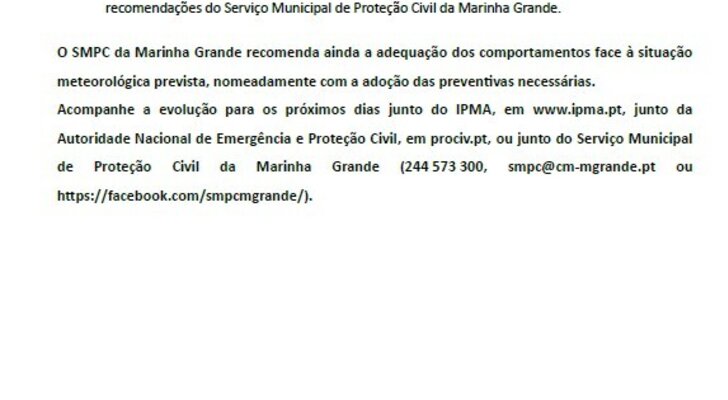 Acompanhe a evolução para os próximos dias junto do IPMA, junto da Autoridade Nacional de Emergência e Proteção Civil , ou junto do Serviço Municipal de Proteção Civil da Marinha Grande (+351 244 573 300, smpc@cm-mgrande.pt ou via Facebook ).