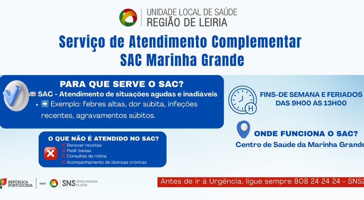 A Unidade Local de Saúde da Região de Leiria (ULS RL) informa que o Serviço de Atendimento Complementar (SAC) da Marinha Grande continua disponível para responder a situações agudas e inadiáveis, garantindo apoio clínico de proximidade à população do concelho.