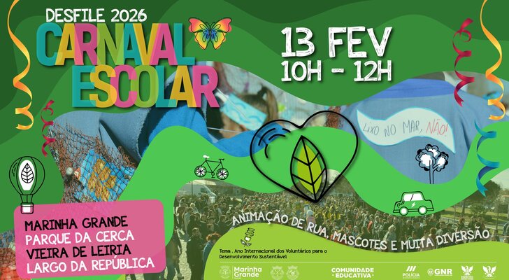 No próximo dia 13 de fevereiro de 2026, entre as 10h00 e as 12h00, realizam‑se os tradicionais Desfiles de Carnaval das Escolas, promovidos pela Câmara Municipal da Marinha Grande, que irão animar as ruas do concelho com cor, criatividade e folia.
