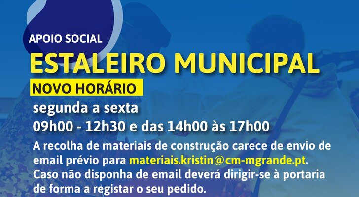O Município da Marinha Grande informa que, a partir de segunda-feira, 23 de fevereiro, o Estaleiro Municipal passará a disponibilizar a entrega de materiais de construção através de uma nova modalidade de atendimento.