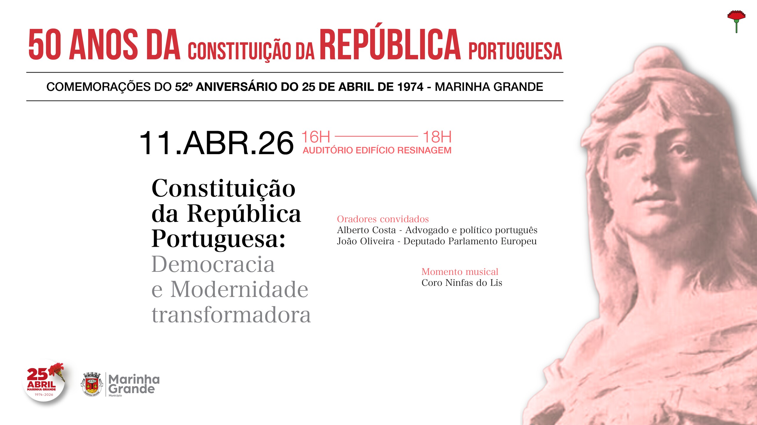 O Município da Marinha Grande comemora, no próximo dia 11 de abril de 2026, o 50 Anos desde a Constituição da República Portuguesa, com um programa cultural que terá lugar entre as 16h00 e as 18h00, no Auditório do Edifício da Resinagem, com entrada gratuita.