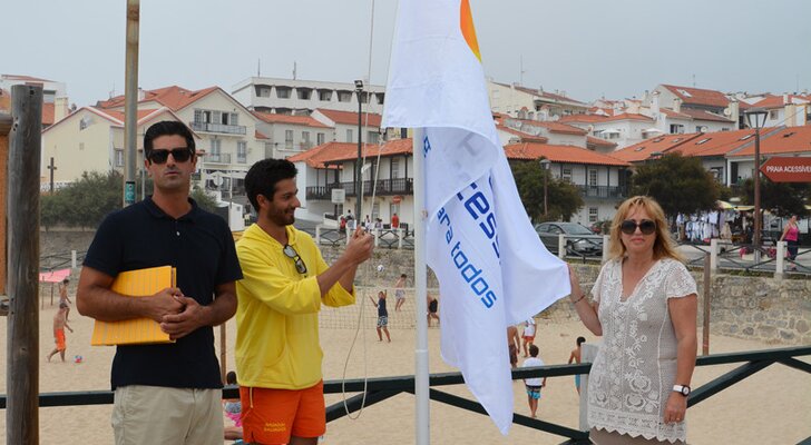 A vice-presidente da Câmara, Cidália Ferreira, e o representante da APA, Edgar Mesquita, acompanhados de um dos nadadores-salvadores de São Pedro de Moel, hastearam a bandeira que confirma a acessibilidade daquela praia, na passada sexta-feira, 4 de agosto.