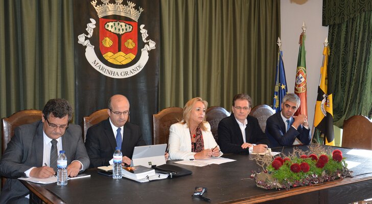 A presidente da Câmara Municipal da Marinha Grande, Cidália Ferreira, o vice-presidente, Carlos Caetano, o presidente da câmara de Alcobaça, Paulo Inácio, o presidente da câmara da Batalha, Paulo Batista, o presidente da câmara de Pombal, Diogo Mateus, e o vereador da câmara de Leiria, Ricardo Santos, estão reunidos esta manhã com a Comissão de Ambiente, Ordenamento do Território, Descentralização, Poder Local e Habitação da Assembleia da República, no Salão Nobre dos Paços do Concelho da Marinha Grande.