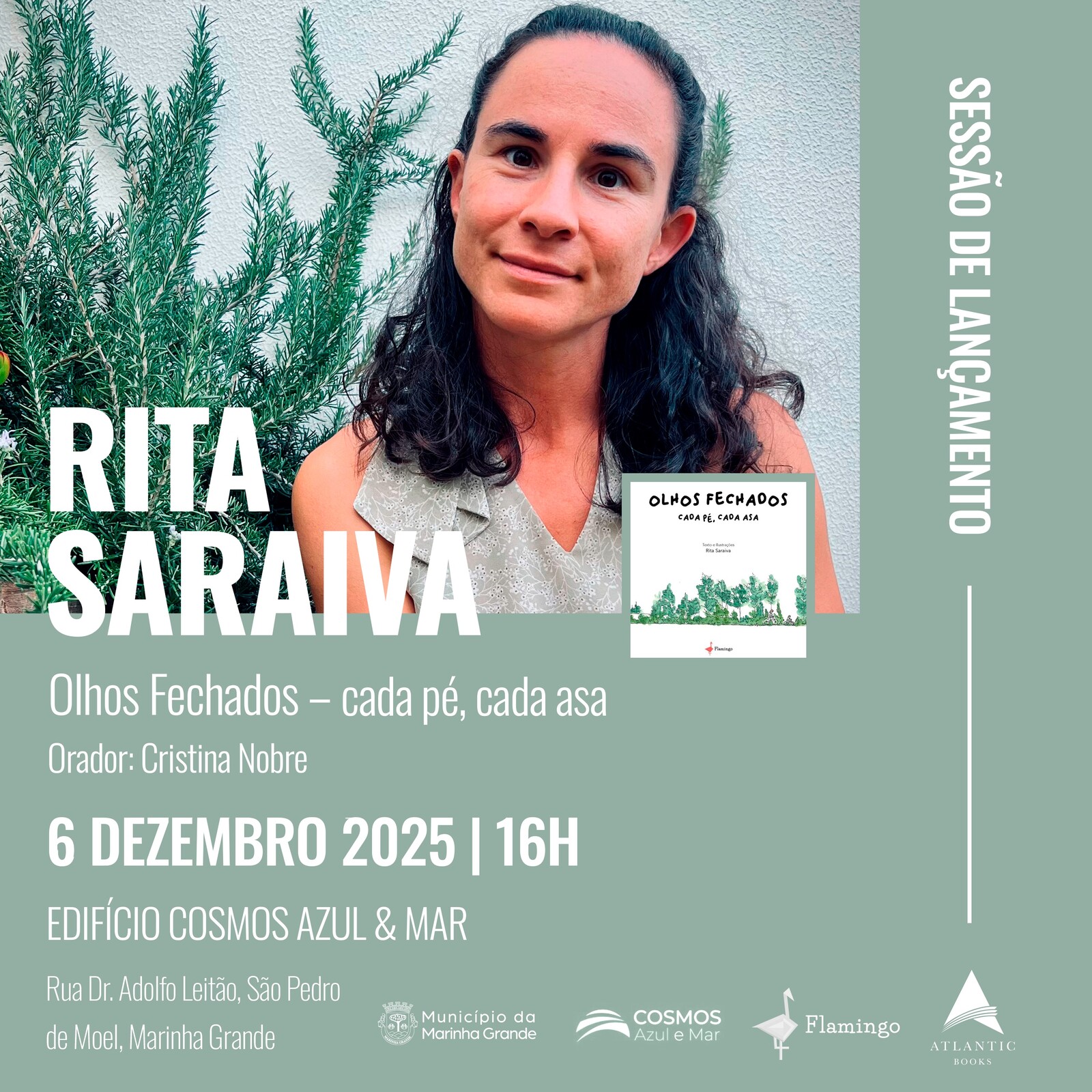 O Município da Marinha Grande promove, no próximo dia 6 de dezembro de 2025, às 16h00, no Edifício Cosmos Azul & Mar, em São Pedro de Moel, a apresentação literária de “Olhos Fechados – cada pé, cada asa”, o primeiro livro infantil da autora local Rita Saraiva, editado pela Flamingo Edições.