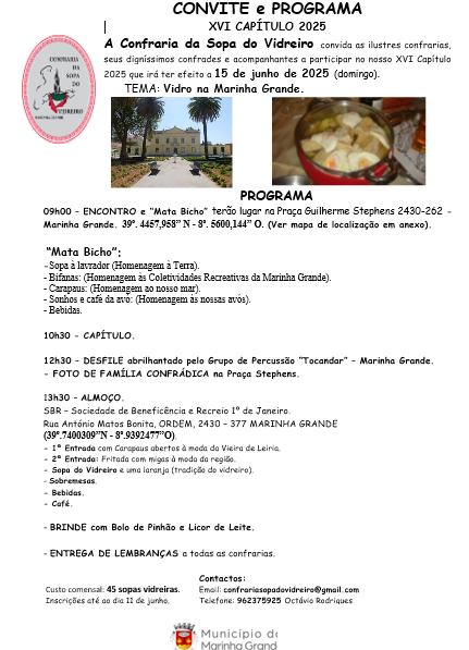 A Confraria da Sopa do Vidreiro realiza o seu XVI Capítulo no dia 15 de junho de 2025 (domingo), na Marinha Grande, com o tema “Vidro na Marinha Grande”.