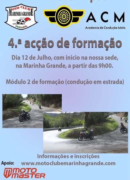 O Moto Clube da Marinha Grande, em parceria com a Academia de Condução Moto (ACM), realiza no próximo dia 12 de julho a 4.ª ação de formação, com início marcado para as 9h00, na sede do clube, localizada na Marinha Grande.