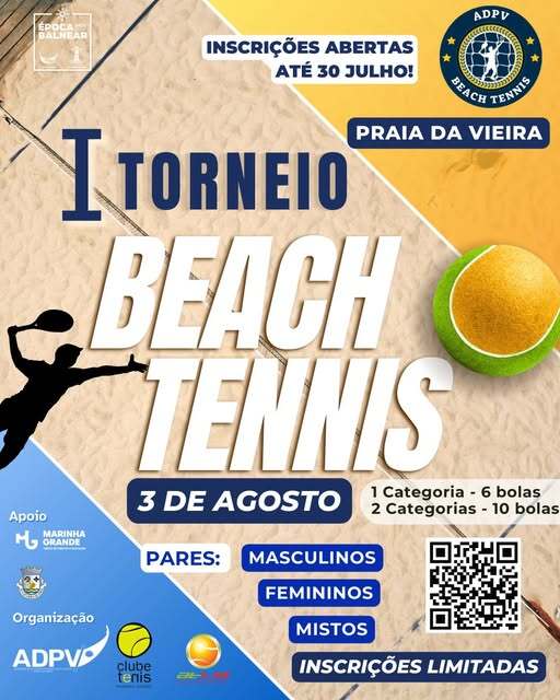 A Praia da Vieira recebe, no próximo dia 3 de agosto, o primeiro Torneio de Beach Tennis, uma iniciativa desportiva que promete animar a época balnear com espírito competitivo, convívio e promoção da atividade física ao ar livre.