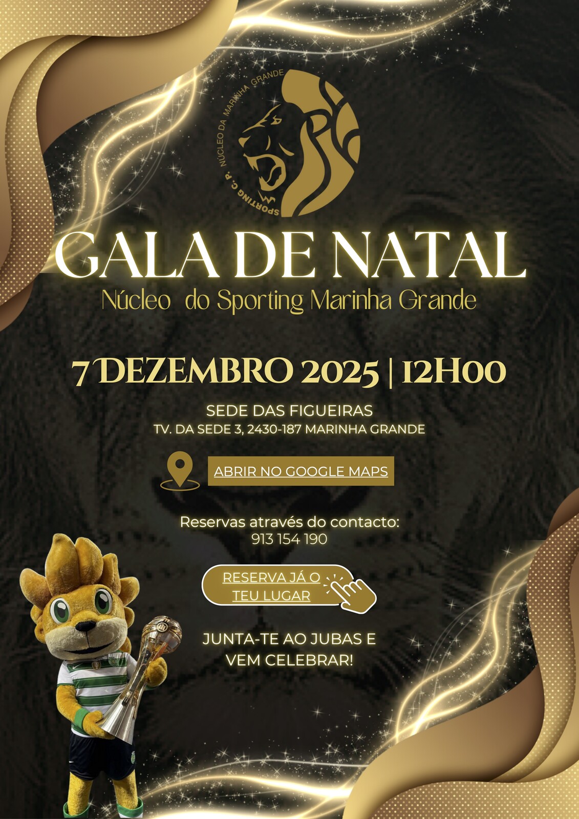 Já estão abertas as reservas para a Gala de Natal, que terá lugar no próximo dia 7 de dezembro de 2025, às 12h00, no Núcleo do Sporting da Marinha Grande.